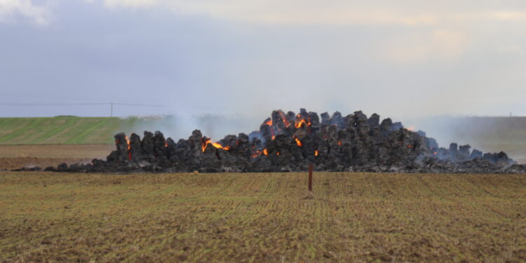 Ya con la luz del día el panorama es más desolador si cabe con la paja que sigue ardiendo y con un fuego que deja miles de euros en pérdidas teniendo en cuenta el aumento de precios que están soportando agricultores y ganaderos por los suministros, entre ellos la propia paja.