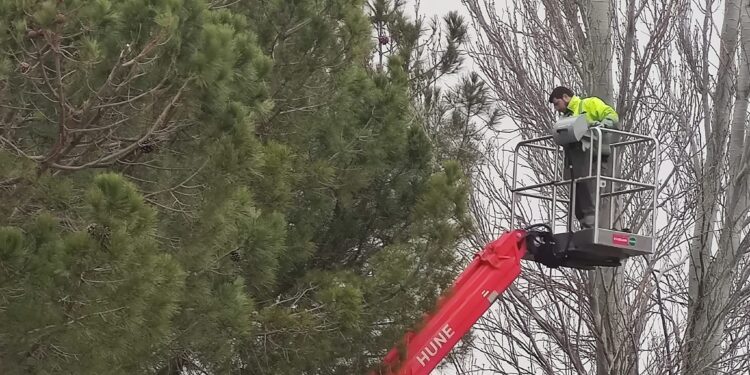 Con ayuda de un camión provisto de una cesta elevadora se están supervisando los lugares donde las orugas tienen sus nidos de cara a colocar los sistemas trampa que se empezaron a probar el año pasado y que han dado óptimos resultados.