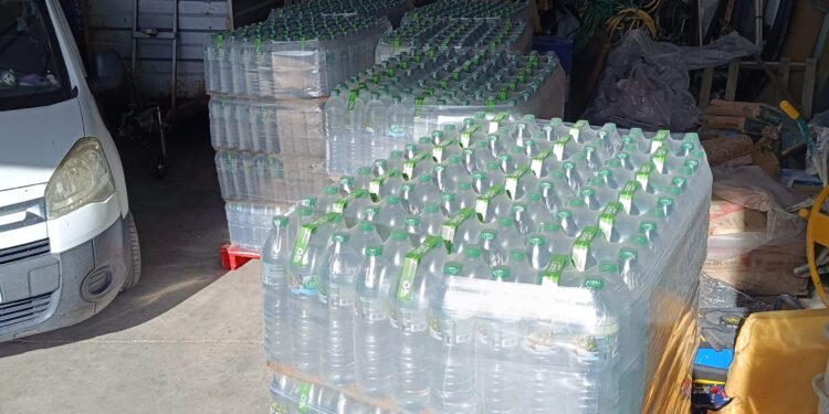 – 5 palets de agua, 1 palet de rollos de papel industrial y 30 garrafas de lejía donados por el Ayuntamiento de Villoria.