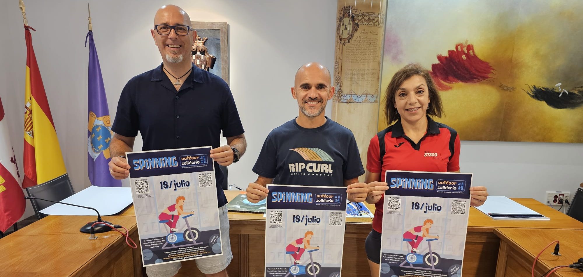 El concejal de Deportes del Ayuntamiento de Peñaranda, Pedro Pérez, acompañado por Ángel García, técnico municipal del área, y por Lucía García, del Triatlón 37300, han presentado esta tarde una nueva edición del spinning solidario que regresará a la plaza de la Constitución el viernes 18 de julio confiando en repetir la gran respuesta de la primera edición del año pasado.