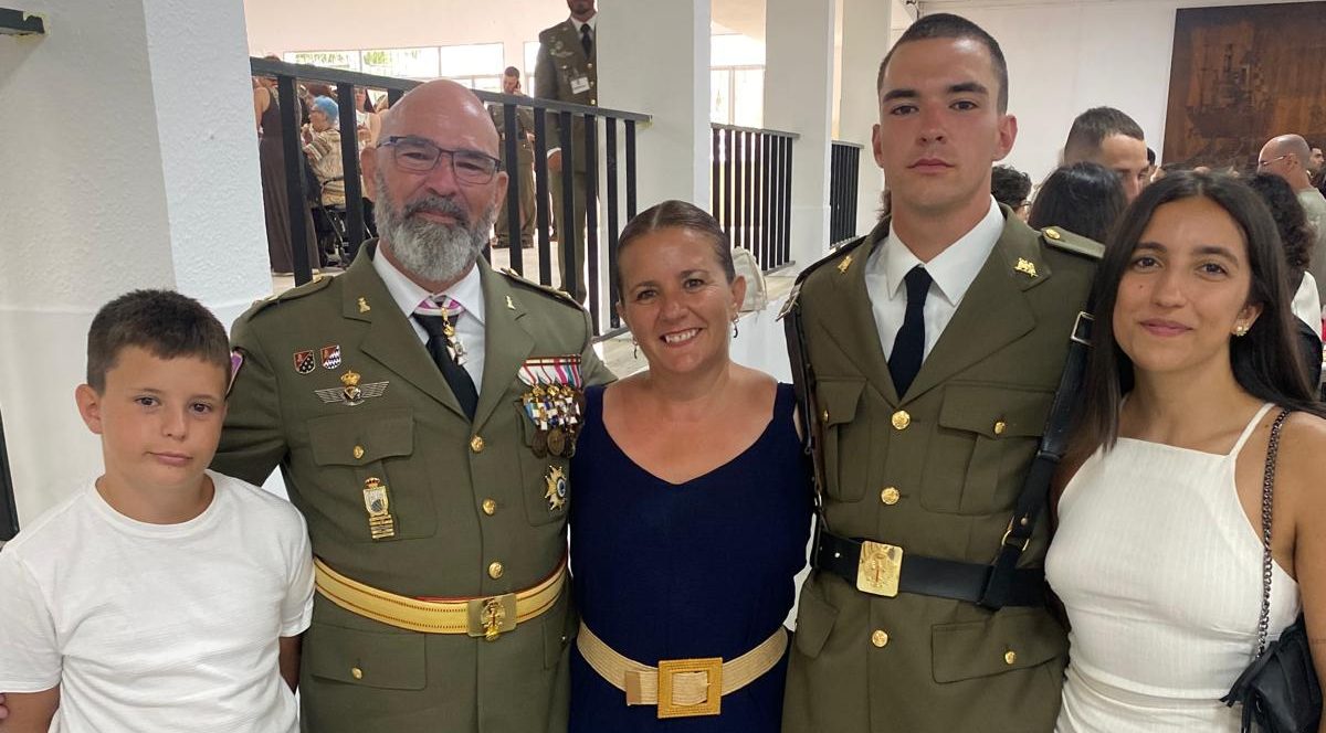 Ángel Gutiérrez Sánchez vivió ayer en San Fernando (Cádiz) su Jura de Bandera como militar profesional en el Ejército de Tierra y lo hizo acompañado por su familia que se desplazó desde Poveda de las Cintas para acompañarle en este momento tan especial y esperado. Ángel sigue así los pasos de su padre, el subteniente Miguel Gutiérrez Nistal, con el que compartió también un emotivo instante cuando el hijo se cuadró ante el padre siguiendo el saludo militar ante un suboficial. Su madre, Goretti; su hermano, Alonso y su novia también fueron testigos de este día inolvidable para todos ellos.