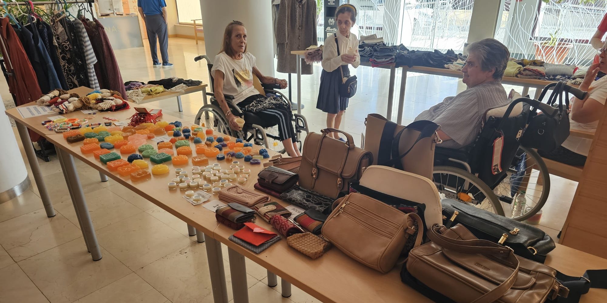 La residencia Albertia Babilafuente acoge desde hoy, lunes, y hasta el viernes un mercadillo solidario que en su primera jornada ha tenido ya una gran acogida entre los propios residentes, sus familiares, el personal del centro y los vecinos de la localidad y de otros pueblos cercanos que también han querido visitarlo. Son los propios residentes los encargados de atender al público y mostrarle todo lo que hay a la venta, a precios prácticamente simbólicos. Desde prendas de vestir y ropa de segunda mano hasta jabones artesanales, pulseras y muñecas de trapo creadas en los talleres de Laborterapia pueden encontrarse en el recibidor de la residencia.