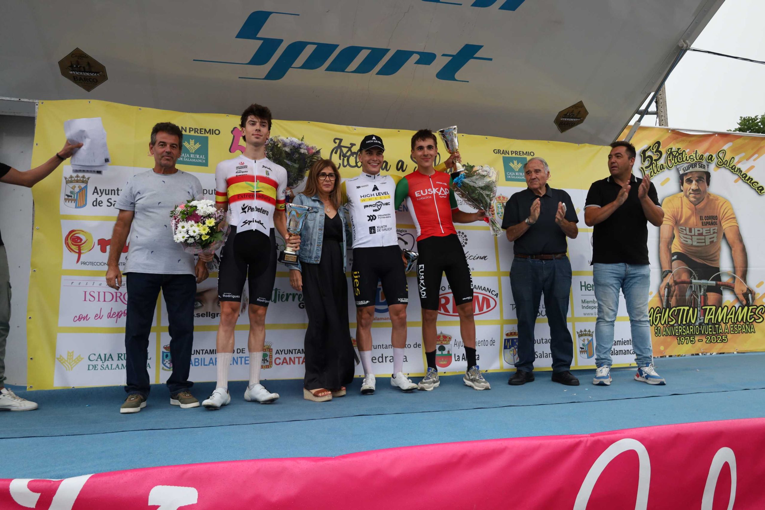 La alcaldesa, Carmen Gómez Fraile, y el concejal Víctor Manuel Sánchez junto al ex ciclista charro Agustín Tamames han participado en la entrega de trofeos en el pódium al término de una etapa deslucida en la meta por la lluvia y el viento y que partió de Cantalpino a las 16:00 horas para recorrer un total de 146 kilómetros por buena parte de las comarcas de Peñaranda y Las Villas.