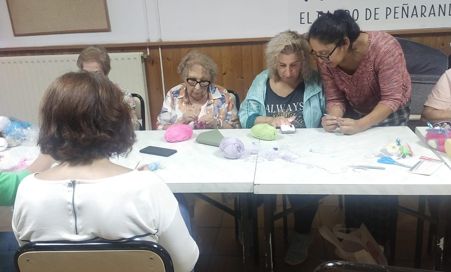 El salón multiusos de El Campo de Peñaranda se ha llenado esta tarde de agujas y lanas de colores, materiales básicos y fundamentales para un taller de iniciación al ganchillo que ha durado dos horas. Las participantes han valorado muy positivamente el resultado de la actividad que ha resultado instructiva a la par que amena y que están deseando volver a repetir para seguir aprendiendo.