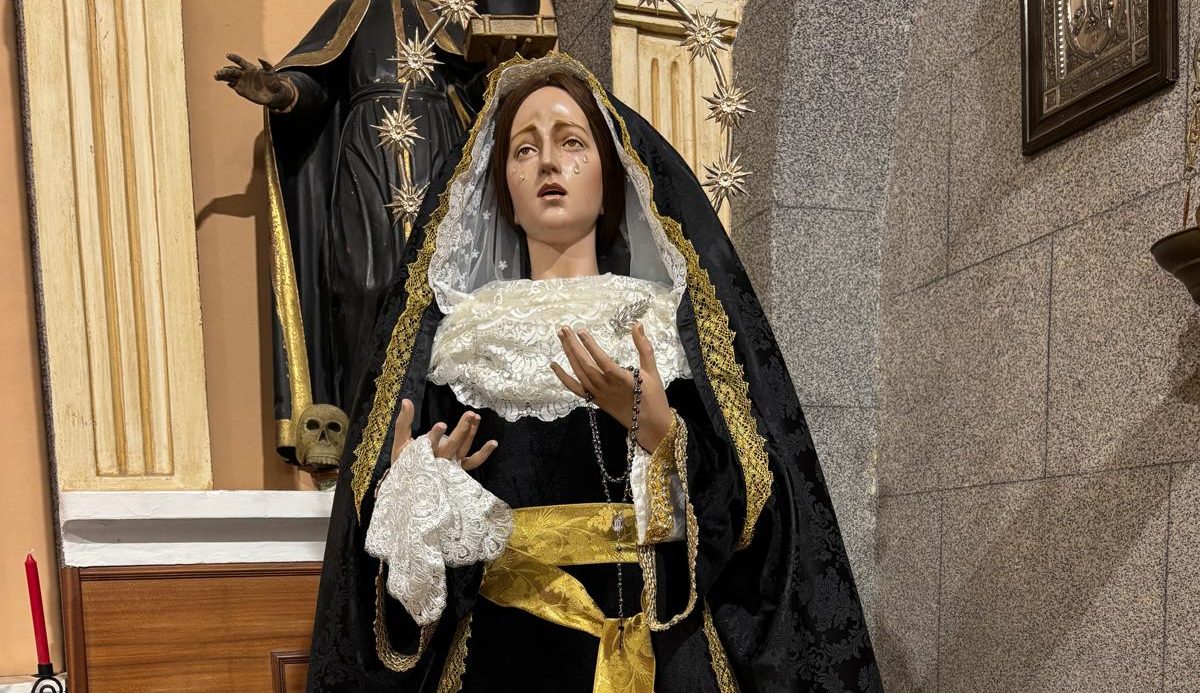 Nuestra Señora de las Lágrimas, imagen mariana titular de la cofradía del Humilladero, aparece hoy, domingo, vestida de luto al igual que esta semana ya lo han hecho las advocaciones de la Esperanza y de la Soledad en la localidad peñarandina. La Virgen, que fue adquirida por suscripción popular en el año 1999, luce una saya de terciopelo negro con bordados en oro viejo y un manto, también, negro en satén brocado. Completa la indumentaria un fajín dorado, un pañuelo de encaje en su mano derecha y un rosario en la izquierda, junto al rostrillo en encaje blanco y un aro de estrellas sobre su cabeza.