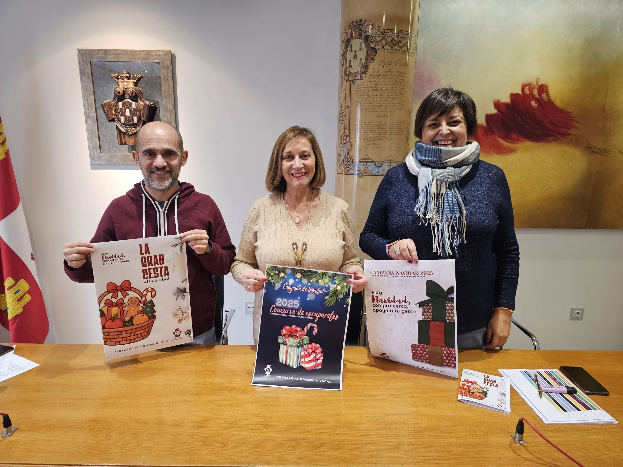 La alcaldesa, Carmen Ávila, junto a los concejales Patro Macías y Pedro Pérez, ha presentado hoy la Gran Cesta del Comercio, eje central de la campaña de compras navideñas en la localidad y a la que ya se han adherido 14 establecimientos aportando productos. En esta campaña podrán participar todas aquellas personas mayores de 18 años que realicen compras en cualquiera de los establecimientos adheridos durante el período de vigencia de la promoción.