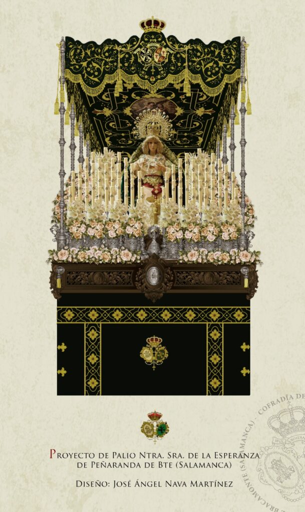 La cofradía de Nuestra Señora de la Esperanza, de Peñaranda, ha aprovechado la festividad de los Reyes Magos para anunciar la llegada de un «gran tesoro» como es el bordado exterior e interior de las bambalinas del paso de palio que ya ha sido culminado y lucirá en la Semana Santa de este año. Arte Sacro Alcántara-Taller de Bordados ha llevado a cabo este trabajo.