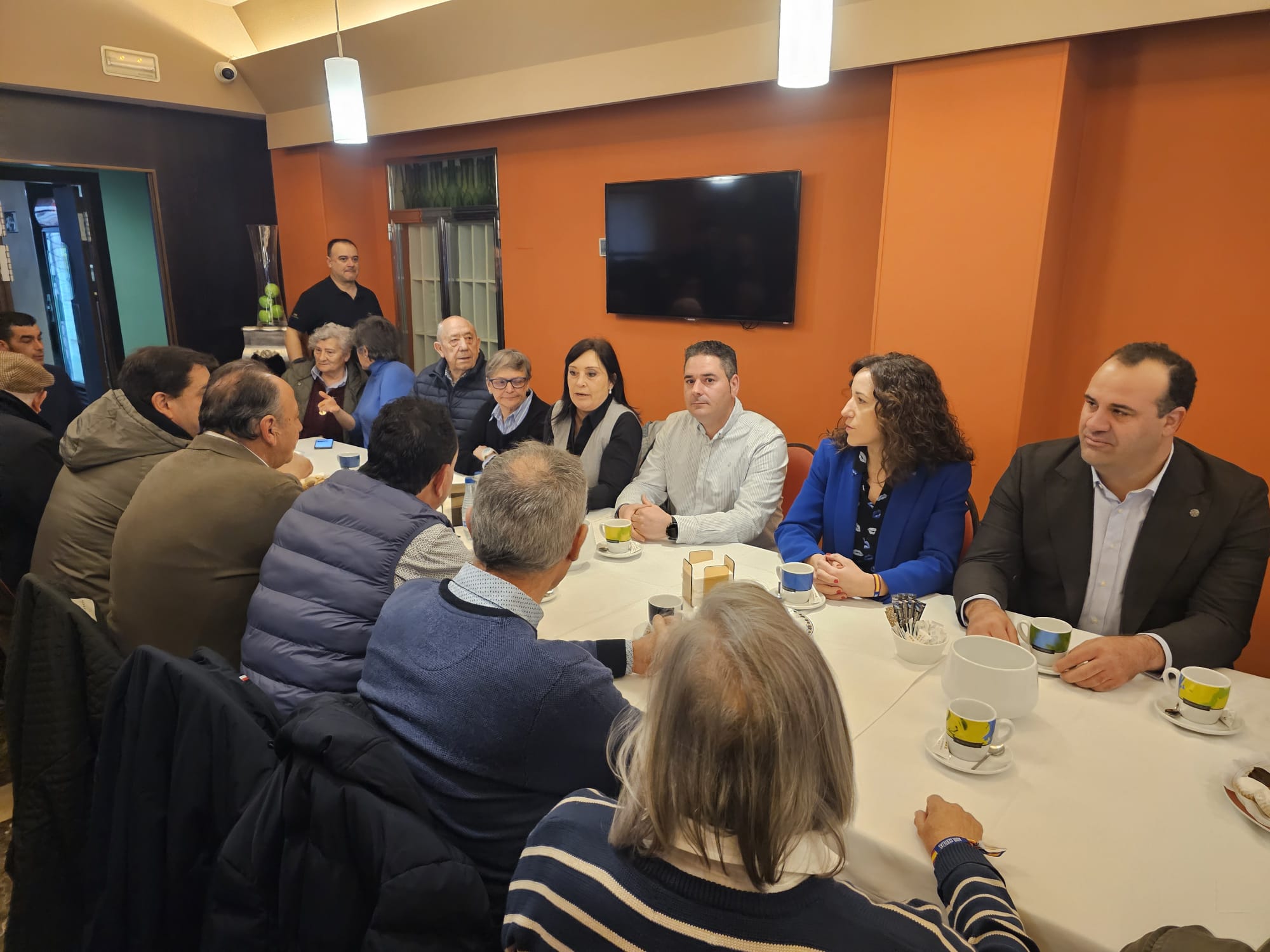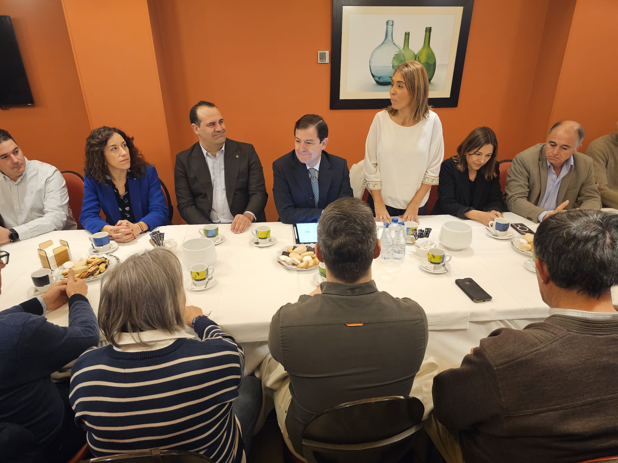 Mañueco desayuna en Peñaranda con alcaldes y concejales del PP y les pide que movilicen a los ciudadanos a votar el día 15