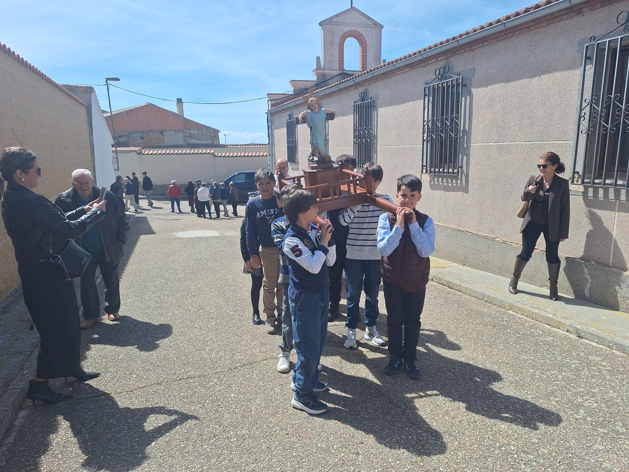 La localidad de Cordovilla, en la comarca de Peñaranda, ha sido un año más fiel a su tradición con una curiosa procesión del Resucitado en la que los niños son los encargados de llevar las andas con la imagen de un Niño Jesús con la cruz. Los adultos han portado la imagen de la Virgen a la que posteriormente se ha quitado el manto de luto para celebrar la alegría de la resurrección. El párroco de la localidad, Manolo Muiños, ha oficiado además la misa dominical.
